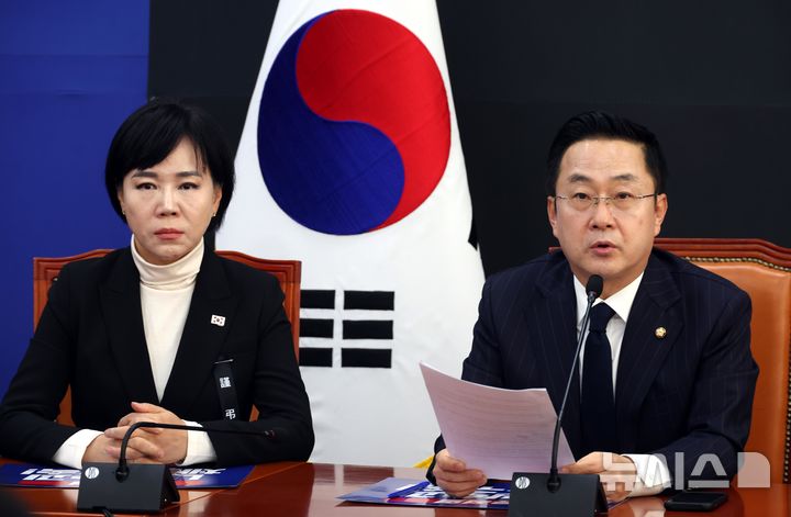 [서울=뉴시스] 조성봉 기자 = 박성준 더불어민주당 원내수석부대표가 4일 오전 서울 여의도 국회에서 열린 민주당 운영위, 법사위, 행안위원 합동 비상연석회의에서 발언을 하고 있다. 왼쪽은 전현희 의원.2025.01.04. [email protected]
