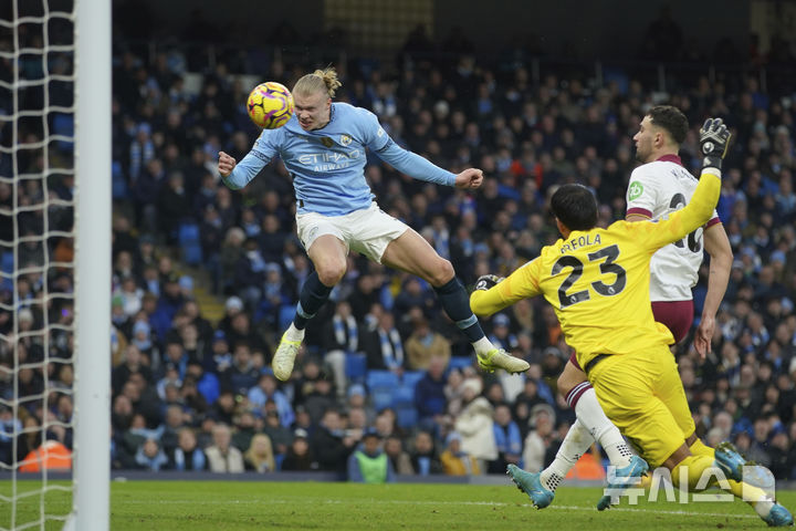 [맨체스터=AP/뉴시스] 맨체스터 시티(맨시티)의 엘링 홀란이 4일(현지시각) 영국 맨체스터의 에티하드 스타디움에서 열린 2024-25 프리미어리그 20라운드 웨스트햄과의 경기 전반 42분 팀 두 번째 골을 넣고 있다. 맨시티는 사비뉴의 2도움과 엘링 홀란의 멀티 골 등을 묶어 4-1로 승리했다. 2025.01.05.