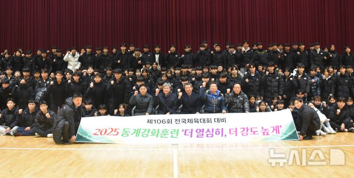 [청주=뉴시스] 윤현우 충북체육회장이 6일 충북 진천군 문백면 충북체육고등학교를 방문해 동계훈련에 참여한 육상 등 13개 종목 지도자와 선수들을 격려한 뒤 기념촬영을 하고 있다. (사진=충청북도체육회 제공) 2025.01..6. [email protected]