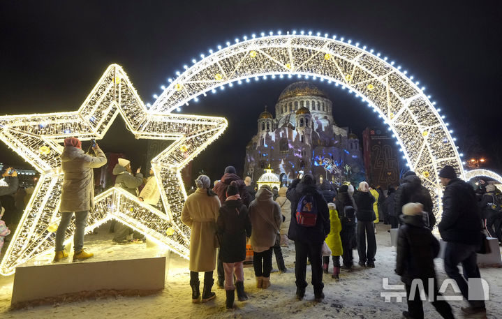 [상트페테르부르크=AP/뉴시스] 6일(현지시각) 러시아 상트페테르부르크 외곽 크론시타트 광장에서 시민들이 정교회 성탄절 전야를 맞아 조명으로 장식된 조형물들을 감상하고 있다. 러시아 정교회에서 사용하는 율리우스력에 따라 러시아 성탄절은 1월 7일이다. 2025.01.07.