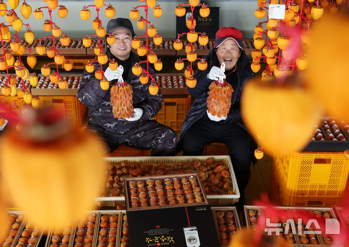 [함양=뉴시스] 8일 경남 함양군 서하면 오현마을 청춘농원 박춘호씨가 제9회 지리산함양 고종시곶감축제에서 선보일 곶감을 들어보이고 있다 제9회 지리산함양 고종시곶감축제는 오는 10일~12일(3일간) 천년의 숲 상림공원 일원에서 열린다(사진= 함양군 제공) 2025. 01. 08. [email protected]