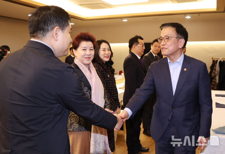 [서울=뉴시스] 조수정 기자 = 최상목 대통령 권한대행 부총리 겸 기획재정부 장관이 8일 정부서울청사에서 열린 주한중국상공회의소(CCCK) 오찬간담회에서 왕이스 차이나유니콤 코리아 사장과 악수하고 있다. 2025.01.08. [email protected]