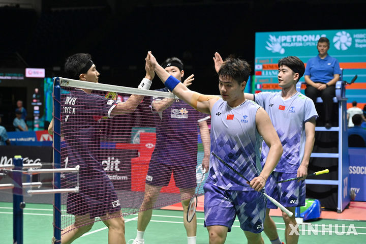[쿠알라룸푸르=신화/뉴시스] 서승재와 김원호(왼쪽)가 9일(현지시각) 말레이시아 쿠알라룸푸르의 부킷 잘릴 악시아타 아레나에서 열린 세계배드민턴연맹(BWF) 월드투어 슈퍼1000 말레이시아 오픈 남자 복식 16강전에서 량웨이컹·왕창 조(2위·중국)를 물리친 후 인사를 나누고 있다. 서승재-김원호 조가 2-0(21-17 21-16)으로 승리하고 8강에 올랐다. 2025.01.10.