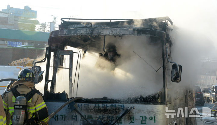 [김제=뉴시스] 김얼 기자 = 10일 전북 김제시 벽지산로에 종교차량으로 추정되는 차량의 원인불명의 화재가 발생해 소방관들이 화재를 진압하고 있다. 2025.01.10. [email protected]