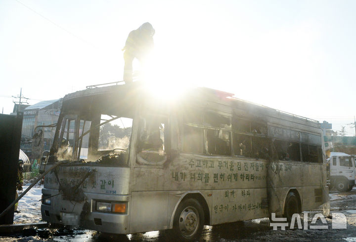 [김제=뉴시스] 김얼 기자 = 10일 전북 김제시 벽지산로에 종교차량으로 추정되는 차량의 원인불명의 화재가 발생해 소방관들이 화재를 진압하고 있다. 2025.01.10. [email protected]