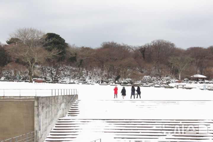 [제주=뉴시스] 양영전 기자 = 제주도 산지와 중산간에 많은 눈이 내려 쌓인 11일 오후 제주시 조천읍 제주돌문화공원을 찾은 관광객들이 설경을 감상하며 즐거운 시간을 보내고 있다. 2024.01.11. [email protected]