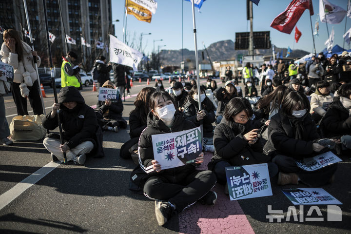 [서울=뉴시스] 정병혁 기자 = 11일 서울 종로구 세종로에서 열린 대학생시국회의 윤석열 퇴진 6차 대학생 시국회의에 참가한 대학생들이 피켓을 들고 있다. 2025.01.11. [email protected]