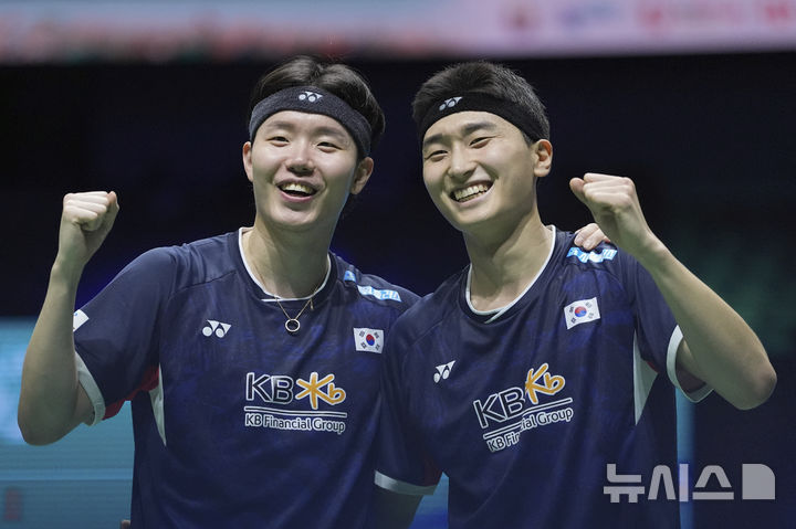 [쿠알라룸푸르=AP/뉴시스] 서승재(왼쪽)와 김원호가 11일(현지 시간) 말레이시아 쿠알라룸푸르의 부킷 잘릴 아시아타 아레나에서 열린 세계배드민턴연맹(BWF) 월드투어 슈퍼1000 말레이시아 오픈 남자 복식 준결승에서 사트위크사이라즈 란키레디-치라그 셰티 조(인도)를 꺾은 후 환호하고 있다. 서승재-김원호 조가 2-0(21-10 21-15)으로 승리하고 결승에 올라 첸보양-리우이 조(중국)와 우승을 다툰다. 2025.01.12.