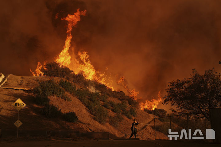 [로스앤젤레스=AP/뉴시스]아널드 슈워제네거 등 많은 유명 인사들이 살고 있는 맨더빌 캐니언으로 팰리세이즈 산불 불길이 확산되자 한 소방관이 화재 진압을 위해 사투를 벌이고 있다. 로스앤젤레스 산불의 급속한 확산을 부른 강풍이 또다시 예보된 가운데 소방관들은 11일(현지시각) 세계적으로 유명한 J. 폴 게티 박물관과 로스앤젤레스 캘리포니아 대학(UCLA)으로 불길이 번지는 것을 막기 위해 안간힘을 쓰면서 새로운 대피 경고를 내려 더 많은 주택 소유자들을 긴장시켰다. 2025.01.12.