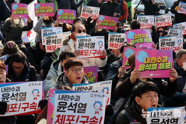 [서울=뉴시스] 이영환 기자 = 한국노총 조합원들이 12일 오후 서울 용산구 윤석열 대통령 관저 인근에서 열린 정권 퇴진 촉구 집회에서 구호를 외치고 있다. 2025.01.12. [email protected]