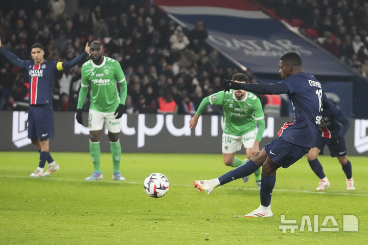 [파리=AP/뉴시스] 파리 생제르맹(PSG)의 우스만 뎀벨레가 12일(현지 시간) 프랑스 파리의 파르크 데 프랭스에서 열린 2024-25 리그1 17라운드 생테티엔과 경기 전반 23분 페널티킥(PK)으로 두 번째 골을 넣고 있다. 뎀벨레는 전반 13분 이강인의 도움으로 선제골을 넣는 등 멀티 골을 기록하며 팀의 2-1 승리를 이끌었다. 2025.01.13.