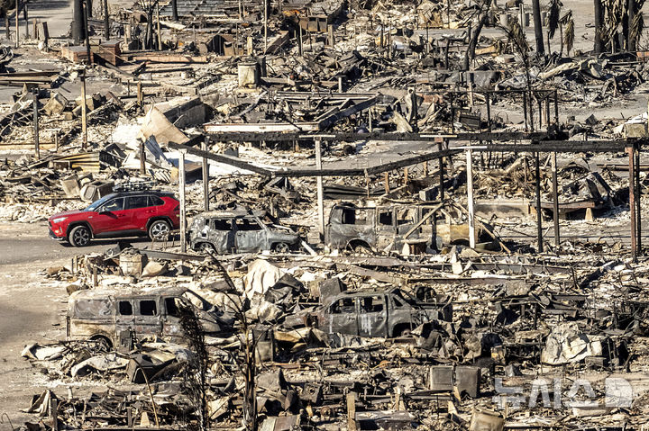 [로스앤젤레스=AP/뉴시스] 12일(현지 시간) 미 캘리포니아주 로스앤젤레스 인근 퍼시픽 팰리세이즈에서 자동차 한 대가 '팰리세이즈 파이어' 산불로 파괴된 집과 차량 잔해 사이를 지나가고 있다. 2025.01.13.