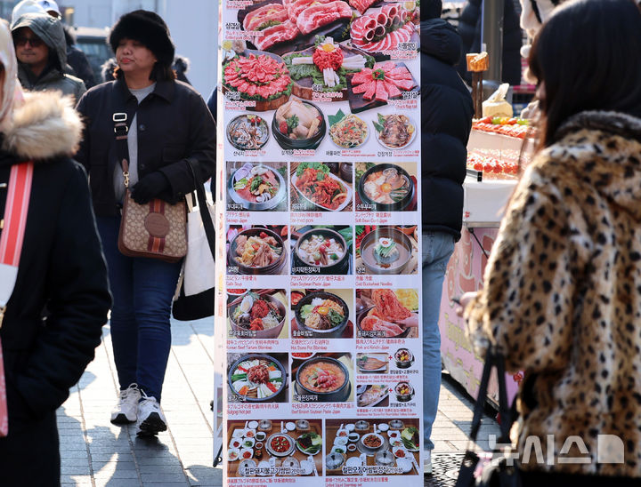 [서울=뉴시스] 이영환 기자 = 13일 서울 중구 명동거리 음식점 앞에 판매되는 음식 종류가 보이고 있다.