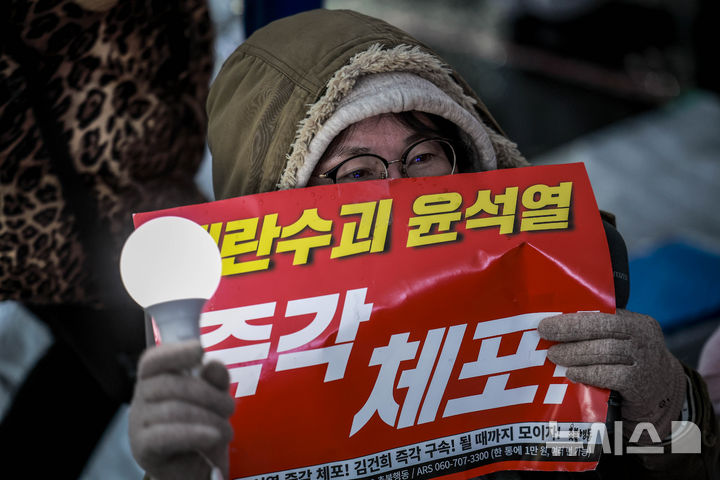 [서울=뉴시스] 정병혁 기자 = 13일 서울 용산구 대통령 관저 인근에서 열린 대통령 체포 촉구 집회 참가자들이 피켓을 들고 있다. 2025.01.13. [email protected]