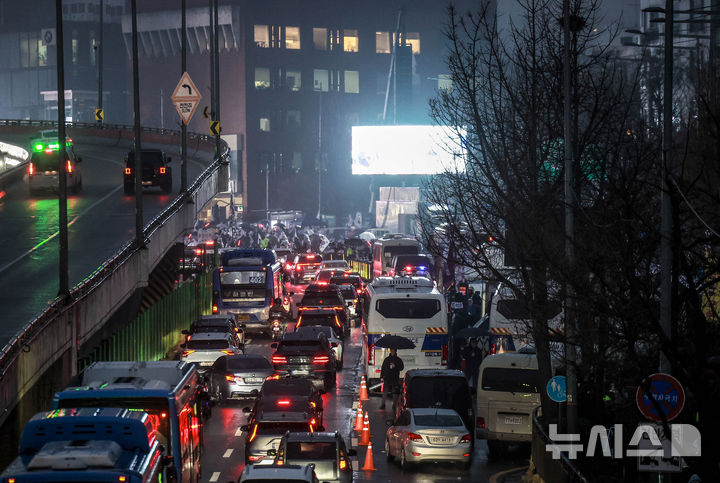[서울=뉴시스] 정병혁 기자 = 윤석열 대통령 탄핵심판 사건의 첫 변론기일을 하루 앞둔 13일 서울 용산구 대통령 관저 앞에 경찰 버스가 세워져 있다. 2025.01.13. [email protected]