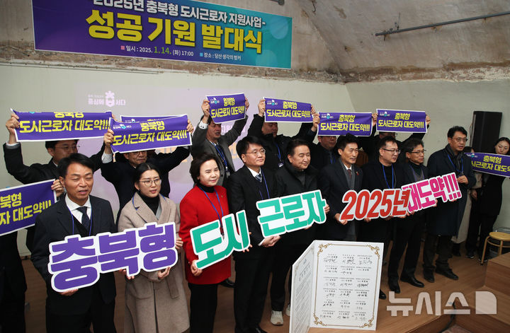 [청주=뉴시스] 14일 충북 청주시 상당구 문화동 당산 생각의 벙커에서 김영환 충북지사와 유관기관 관계자 등이 2025년 충북형 도시근로자 지원사업의 성공을 기원하는 퍼포먼스를 하고 있다.