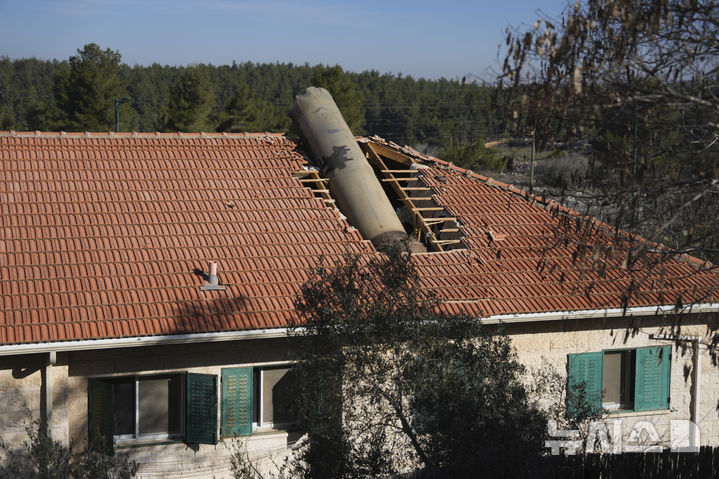 [예루살렘=AP/뉴시스] 14일(현지 시간) 예루살렘 근처 이스라엘 마을 메보 베이타르의 한 주택 지붕에 예멘 후티 반군이 발사한 미사일 파편이 떨어져 있다. 2025.01.14.