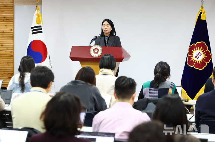 [서울=뉴시스] 황준선 기자 = 천재현 헌법재판소 공보관이 14일 서울 종로구 헌법재판소에서 정례 브리핑을 하고 있다. 2025.01.14. [email protected]