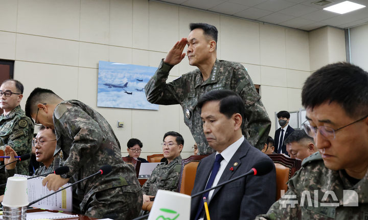 [서울=뉴시스] 조성우 기자 = 김명수 합참의장이 14일 오전 서울 여의도 국회에서 열린 윤석열 정부의 비상계엄 선포를 통한 내란 혐의 진상규명 국정조사 특별위원회 제3차 전체회의에 출석하며 거수경례를 하고 있다. 2025.01.14. [email protected]