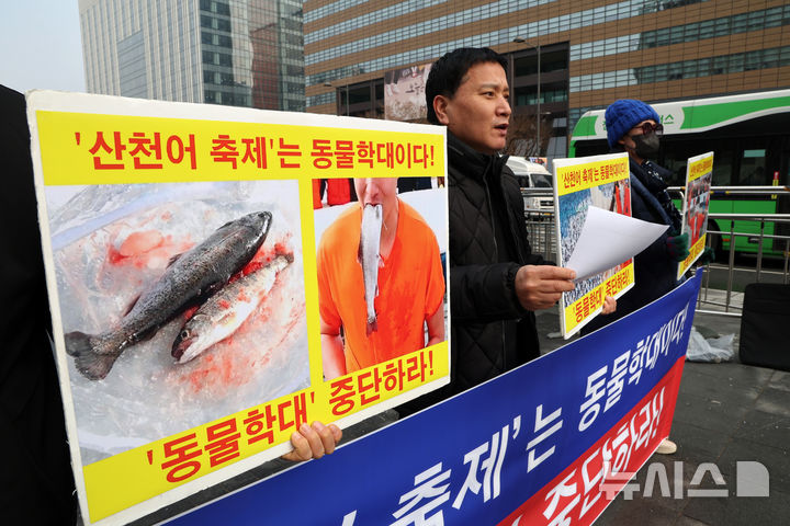 [서울=뉴시스] 배훈식 기자 = 한국동물보호연합 회원들이 14일 오후 서울 종로구 광화문광장에서 산천어 축제 중단을 촉구하고 있다. 2025.01.14. [email protected]