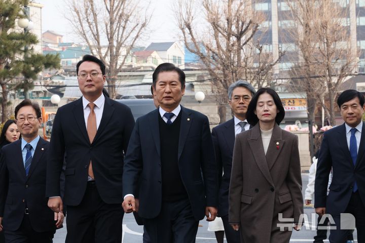 [서울=뉴시스] 황준선 기자 = 윤석열 대통령의 탄핵심판 첫 변론기일인 14일 오후 정청래 단장 등 탄핵소추단이 서울 종로구 헌법재판소에 출석하고 있다. (공동취재) 2025.01.14. [email protected]