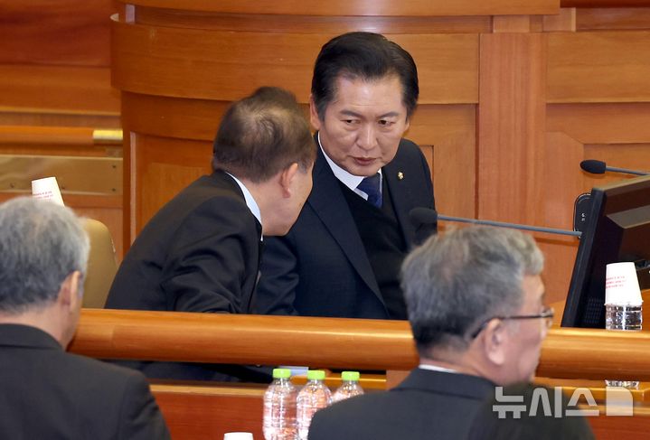 [서울=뉴시스] 황준선 기자 = 윤석열 대통령의 탄핵심판 첫 변론기일인 14일 오후 정청래 탄핵소추단 단장이 서울 종로구 헌법재판소 심판정에서 김이수 변호사와 대화를 나누고 있다. (공동취재) 2025.01.14. [email protected]