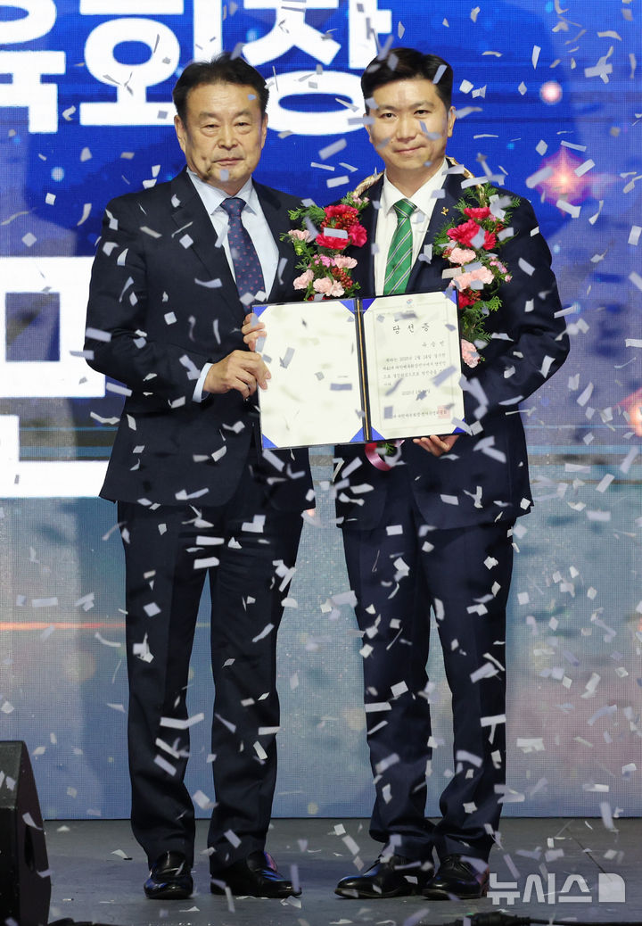 [서울=뉴시스] 김진아 기자 = 제42대 대한체육회장으로 당선된 유승민이 14일 서울 송파구 올림픽공원 올림픽홀에서 열린 제42대 대한체육회장선거에서 김대년 선거운영위원회 위원장으로부터 당선증을 받은 뒤 기념촬영을 하고 있다. 2025.01.14. [email protected]