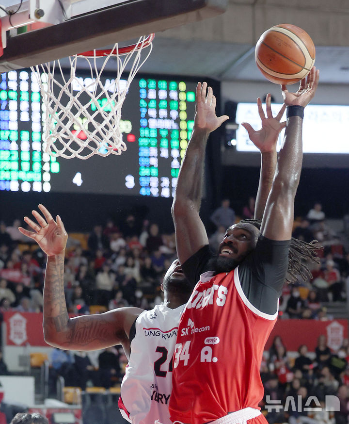 [서울=뉴시스] 김명년 기자 = 14일 오후 서울 송파구 잠실실내체육관에서 열린 '2024-2025 KCC 프로농구' SK 나이츠와 정관장의 경기, SK 나이츠 자밀 워니가 리바운드를 성공시키고 있다. 2025.01.14. [email protected]