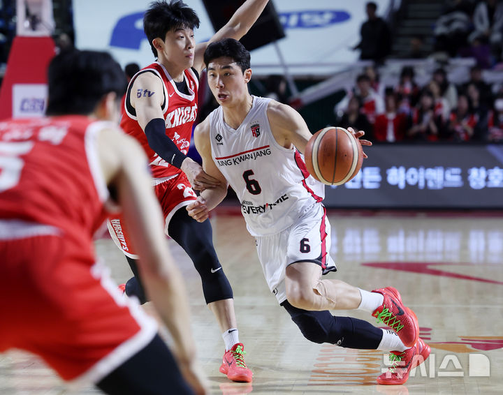 [서울=뉴시스] 김명년 기자 = 14일 오후 서울 송파구 잠실실내체육관에서 열린 '2024-2025 KCC 프로농구' SK 나이츠와 정관장의 경기, 정관장 박지훈이 돌파하고 있다. 2025.01.14. [email protected]