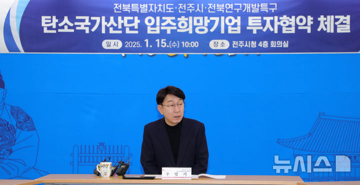 [전주=뉴시스] 김얼 기자 = 우범기 전주시장이 15일 전북 전주시 전주시청 회의실에서 열린 '탄소국가산단 입주희망기업 투자협약 체결식'에 참석해 인사말을 하고 있다. 2025.01.15. [email protected]