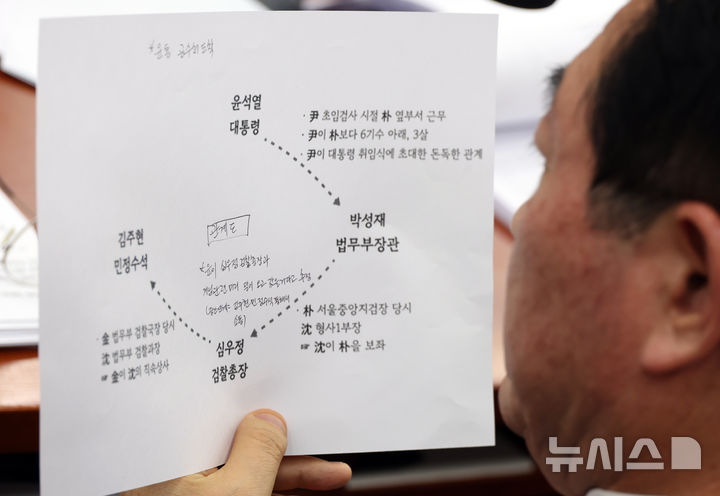 [서울=뉴시스] 고승민 기자 = 민홍철 더불어민주당 의원이 15일 서울 여의도 국회에서 열린 제420회국회(임시회) 제4차 윤석열 정부의 비상계엄 선포를 통한 내란 혐의 진상규명 국정조사특별위원회 전체회의에서 윤석열 대통령과 박성재 법무부 장관 등의 관계도를 보고 있다. 2025.01.15. [email protected]