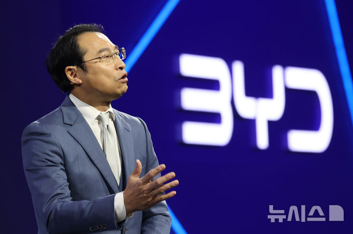 [인천=뉴시스] 전진환 기자 = 16일 오전 인천 중구 상상플랫폼에서 열린 중국 BYD 승용 브랜드 런칭 미디어 쇼케이스 행사에서 류쉐량 BYD 아시아태평양 자동차 영업사업부 총경리가 브랜드를 소개하고 있다.