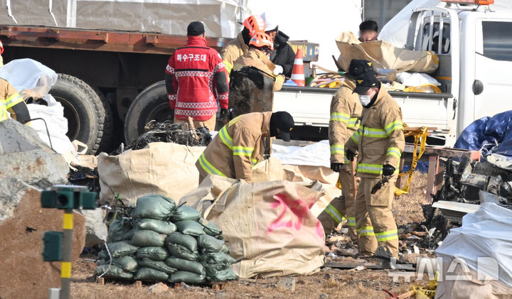 [무안=뉴시스] 김혜인 기자 = 16일 오후 제주항공 여객기 참사가 발생한 전남 무안국제공항에서 사고 잔해 수습 작업이 진행되고 있다. 2025.01.16. [email protected]