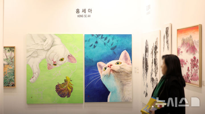 [서울=뉴시스] 김선웅 기자 = 16일 서울 강남구 코엑스에서 열린 월드아트엑스포 2025에서 관람객들이 다양한 미술 작품을 관람하고 있다. 2025.01.16. [email protected]