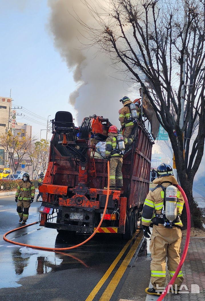 [밀양=뉴시스] 안지율 기자 = 17일 오후 경남 밀양시 삼문동 밀양대로에서 상남방면으로 달리던 5t 집게차 하이카 차량 적재함에서 화재가 발생해 소방대원들이 진화작업을 벌이고 있다. 2025.01.17. [email protected]