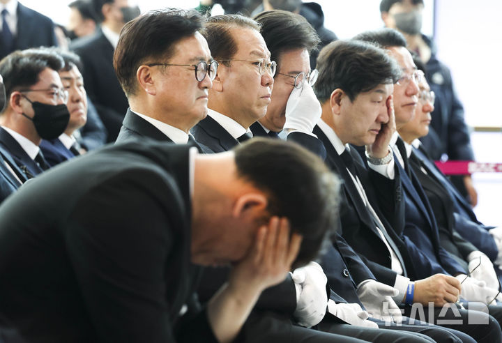 [무안=뉴시스] 최진석 기자 = 박한신 제주항공 참사 유가족협의회 대표와 이재명 더불어민주당 대표, 권성동 국민의힘 원내대표가 18일 전남 무안국제공항에서 열린 제주항공 여객기 사고 합동 추모식에서 진도 씻김굿 보존회의 추모공연 길닦음을 바라보며 눈물을 닦고 있다. 2025.01.18. [email protected]