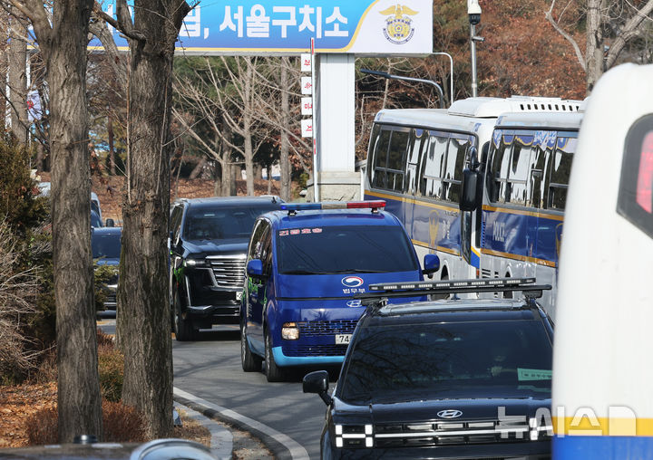 [의왕=뉴시스] 김금보 기자 = 윤석열 대통령이 탑승한 차량 행렬이 18일 경기도 의왕시 서울구치소에서 나와 구속 전 피의자심문이 열리는 서울서부지법으로 향하고 있다. (공동취재) 2025.01.18. [email protected]