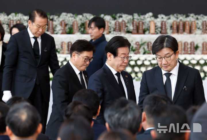 [무안=뉴시스] 최진석 기자 = 권영세(왼쪽부터) 국민의힘 비상대책위원장과, 우원식 국회의장, 이재명 더불어민주당 대표, 권성동 국민의힘 원내대표가 18일 전남 무안국제공항에서 열린 제주항공 여객기 사고 합동 추모식에서 헌화 뒤 이동하고 있다. 2025.01.18. [email protected]