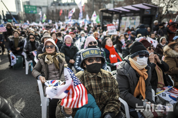 [서울=뉴시스] 정병혁 기자 = 18일 서울 종로구 동화면세점 인근에서 열린 윤석열 대통령 탄핵 반대 집회에서 참가자들이 태극기와 성조기를 흔들며 구호를 외치고 있다. 2025.01.18. [email protected]