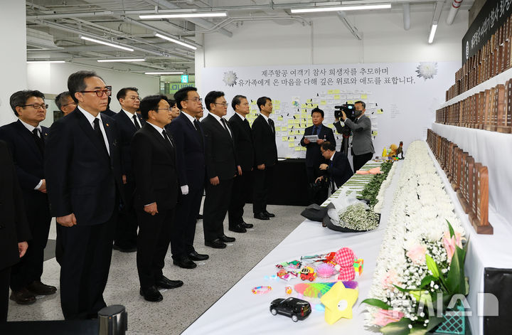 [광주=뉴시스] 최진석 기자 = 최상목 대통령 권한대행 부총리 겸 기획재정부 장관을 비롯한 국무위원들이 18일 광주광역시 동구 전일빌딩245에 마련된 12·29 제주항공 여객기 참사 희생자 합동 분향소에서 헌화하고 있다. (대통령실통신사진기자단) 2025.01.18. [email protected]