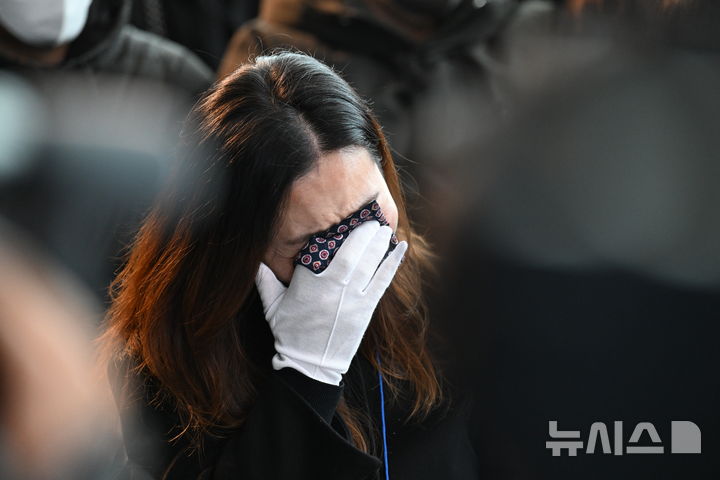 [무안=뉴시스] 이영주 기자 = 12·29 제주항공 여객기 참사 정부 합동추모식이 열린 18일 오전 전남 무안군 무안국제공항에서 한 유족이 눈물을 훔치고 있다. (사진 = 광주·전남사진기자단 공동취재) 2025.01.18. [email protected]