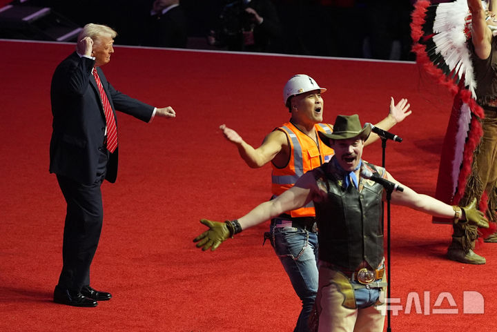 [워싱턴=AP/뉴시스] 도널드 트럼프 미국 대통령 당선인이 19일(현지 시간) 워싱턴에서 열린 대통령 취임식 전야 집회에서 빌리지 피플과 함께 'Y.M.C.A' 공연에 맞춰 춤추고 있다. 2025.01.20.