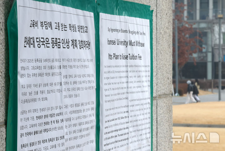[서울=뉴시스] 전신 기자 = 교육부의 대학 등록금 동결 호소와 학생들의 반발에도 인상을 강행하는 사립대가 늘고 있는 가운데 20일 서울 서대문구 연세대학교에 등록금 인상 철회를 촉구하는 대자보가 붙어 있다.