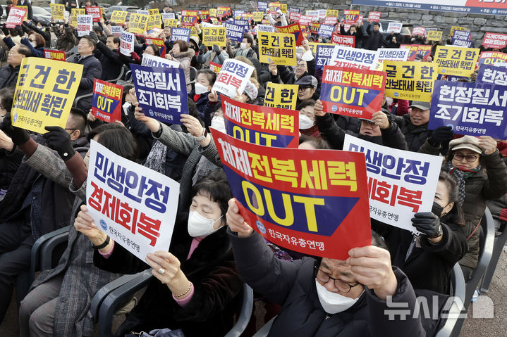 [서울=뉴시스] 최동준 기자 = 20일 서울 중구 한국자유총연맹 자유센터 이승만 대통령 동상 앞에서 열린 '대한민국 자유민주주의 체제 수호와 안보 지킴이 대국민 메시지' 행사에서 강석호 한국자유총연맹 총재를 비롯한 참석자들이 구호제창을 하고 있다. 2025.01.20. [email protected]