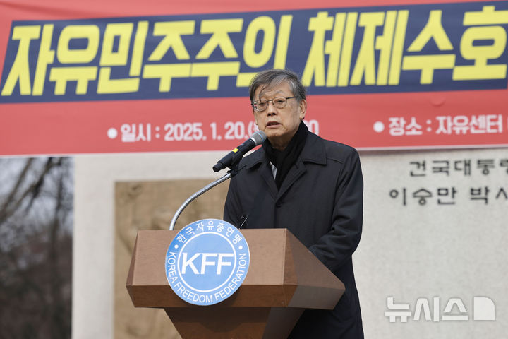 [서울=뉴시스] 최동준 기자 = 20일 서울 중구 한국자유총연맹 자유센터 이승만 대통령 동상 앞에서 열린 '대한민국 자유민주주의 체제 수호와 안보 지킴이 대국민 메시지' 행사에서 김황식 전 국무총리가 격려사를 하고 있다. 2025.01.20. [email protected]