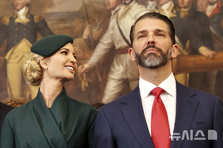 [워싱턴=AP/뉴시스] 도널드 트럼프 미국 대통령 당선인의 장녀 이방카 트럼프와 장남 도널드 트럼프 주니어가 20일(현지 시간) 부친의 취임식이 열리는 미 연방의회 의사당 로툰다 홀 가족석에서 취임식을 기다리고 있다. 2025.01.21.
