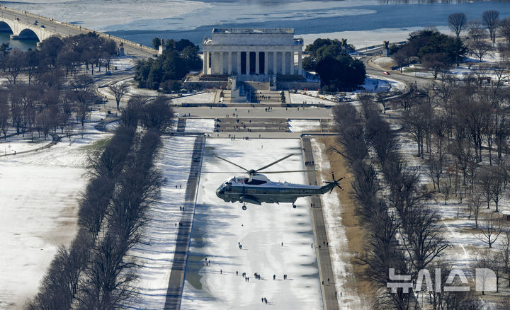 [워싱턴=AP/뉴시스] 조 바이든 전 미국 대통령과 부인 질 여사가 20일(현지 시간) 워싱턴 연방의회 의사당 로툰다 홀에서 열린 도널드 트럼프 신임 대통령의 취임식 참석을 마친 후 전용 헬기 '마린 원'에 탑승해 링컨 기념관을 지나 앤드루스 합동기지로 향하고 있다. 2025.01.21.