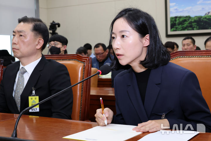 [서울=뉴시스] 조성우 기자 = 박은진 대유에이텍 부사장(박영우 회장 차녀)이 21일 서울 여의도 국회에서 열린 환경노동위원회의 쿠팡 택배노동자 심야노동 등 근로조건 개선을 위한 청문회에서 의원 질의에 답변하고 있다. 2025.01.21. [email protected]