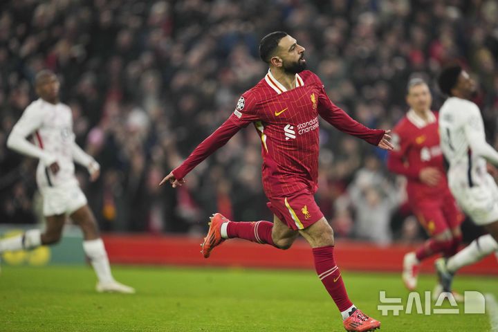 [리버풀=AP/뉴시스] 리버풀(영국)의 모하메드 살라가 21일(현지 시간) 영국 리버풀의 안필드에서 열린 2024-25 유럽축구연맹 챔피언스리그(UCL) 리그 페이즈 7차전 릴(프랑스)과의 경기 전반 34분 선제골을 넣고 세리머니하고 있다. 리버풀이 2-1로 승리하고 16강 진출을 확정했다. 2025.01.22.