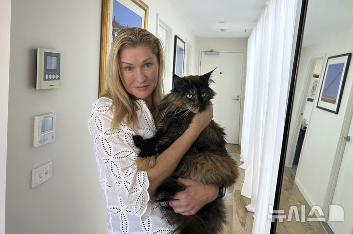 [멜버른=AP/뉴시스] 뉴질랜드에서 호주로 이사하는 주인과 함께 비행기에 탔던 고양이 '미튼스'(Mittens)가 24시간 동안 뉴질랜드와 호주를 세 차례 오가는 일이 발생했다. 8살 된 '미튼스'는 지난달 13일(현지 시간) 뉴질랜드 크라이스트처치에서 호주행 여객기 화물칸에 실렸으나, 도착지인 호주에서 화물 취급자의 실수로 비행기에서 내리지 못하고 뉴질랜드로 되돌아갔다. 뒤늦게 이 사실이 밝혀지면서, 고양이는 주인 마고 니어스가 의뢰한 반려동물 업체의 조치로 다시 호주로 돌아와 가족과 재회했다. 사진은 지난 1월 22일 '미튼스'가 주인 마고 품에 안겨 있는 모습. 2025.01.22.